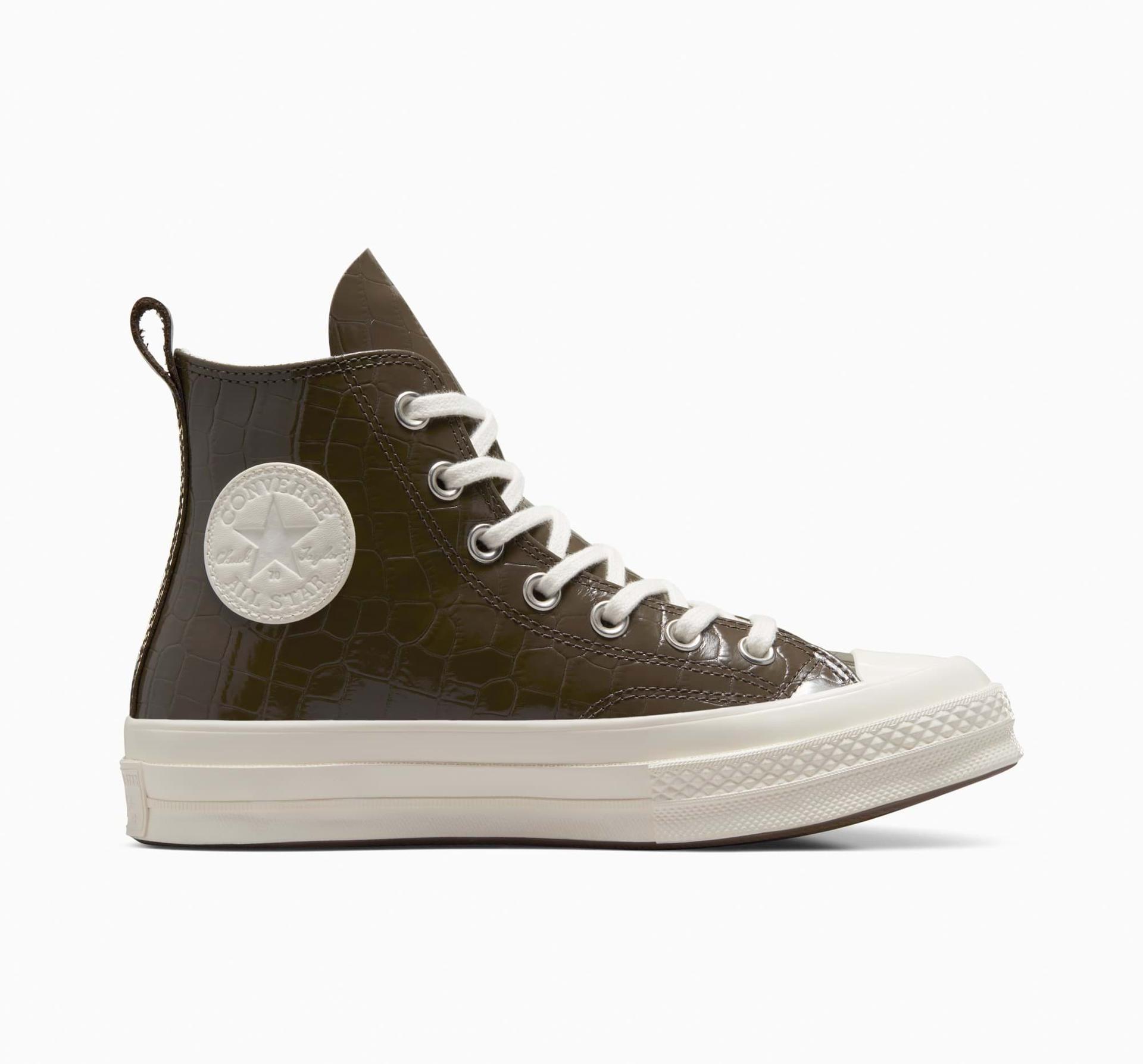Pozrite sa do divočiny v prémiových teniskách Chuck 70. Štýlový zvršok má lesklý krokodílí kožený vzor, vďaka ktorému vyzerá luxusne. Navyše vďaka neutrálnym farbám a detailom v zladených odtieňoch sa hodí ku všetkému.