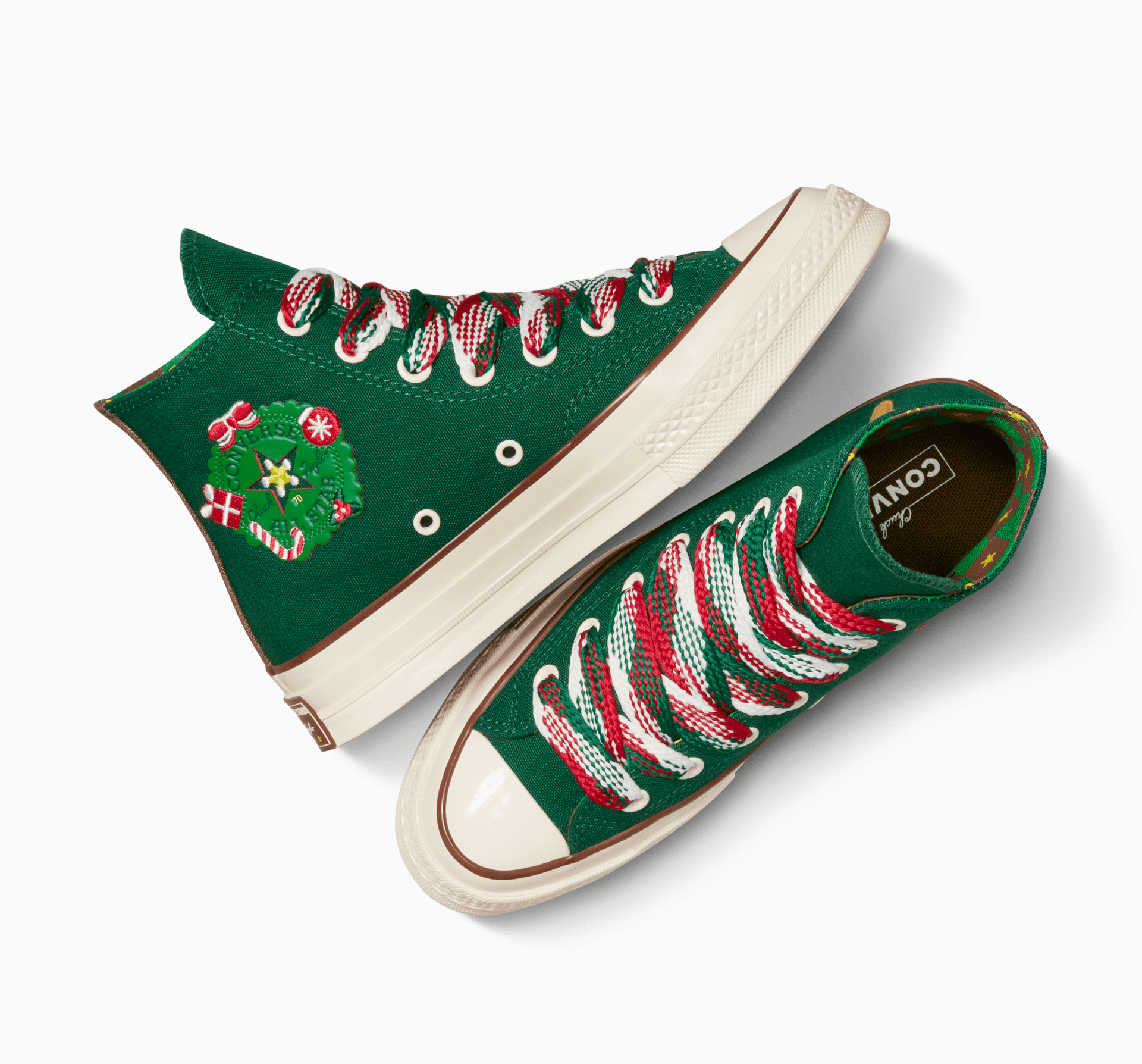Aký vianočný darček si zadovážite tento rok do šatníka? Vianočné tenisky Chuck 70. Ozdobili sme ich kombináciou červenej a zelenej, aby vyzerali vianočne na každom kroku. Nastal čas vytiahnuť pletené ponožky, takže naši kúzelní pomocníci v dielni Converse pribalili k teniskám ešte odnímateľné pletené ponožky, aby bol každý outfit skutočne kúzelný. A bez cukroviniek predsa nie sú Vianoce. Takže sme pridali aj obľúbeného Medovníčka — a pretože ste tento rok naozaj poslúchali (a váš šatník bol nádherný), je tu dvakrát: v odnímateľnej pletenej verzii a ako potlač na strane. Ale čo mašľa? Tá predsa nesmie na vianočných teniskách Chuck 70 chýbať. Preto ich tiež dostanete s dvomi pármi šnúrok, aby ste si ich mohli ozdobiť podľa chute.