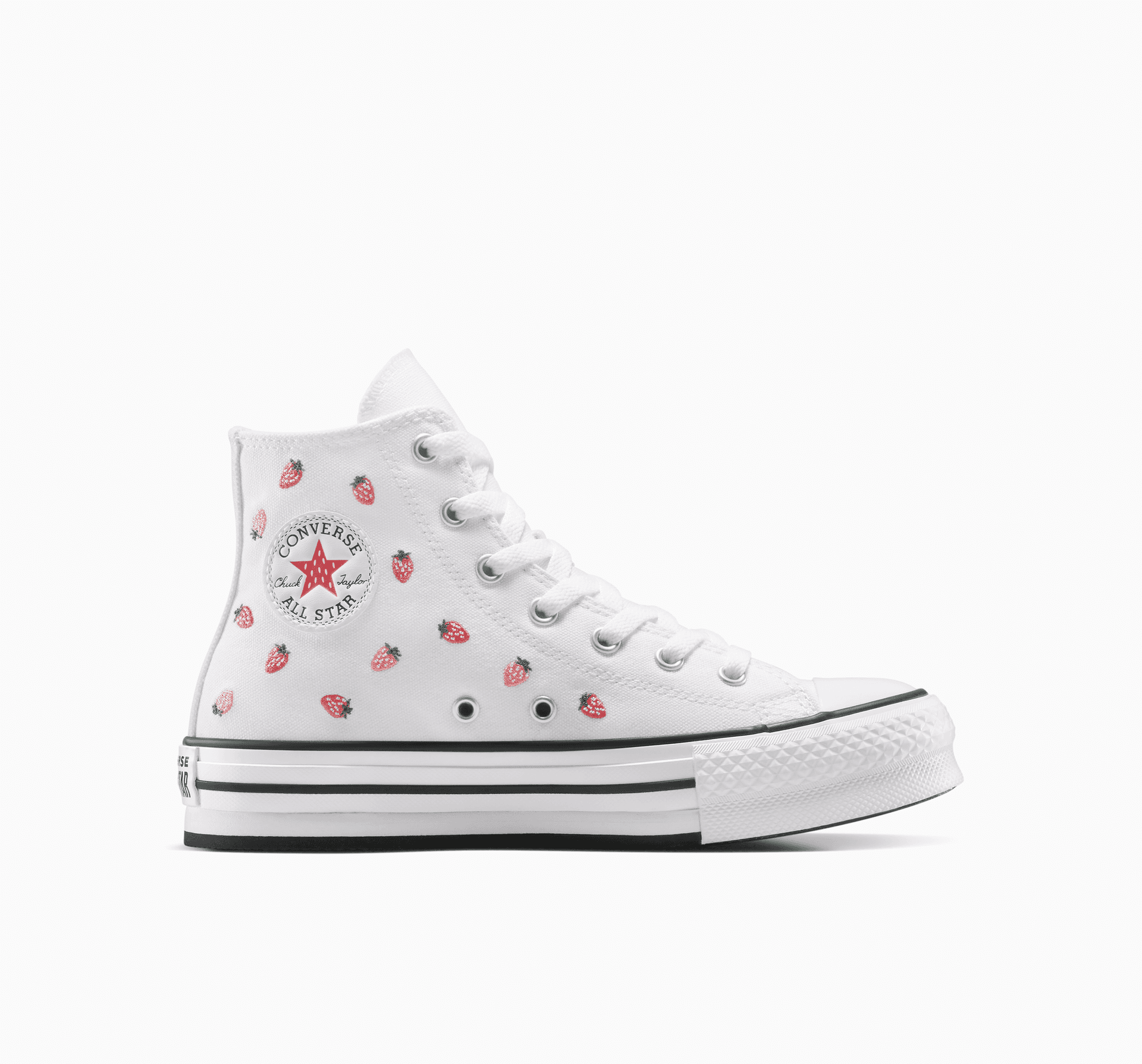 Z takýchto tenisiek budú mať radosť, už nemusíte robiť nič viac. Vyšívané jahody na vyvýšených teniskách Chuck urobia z každého oblečenia sladké pokušenie.