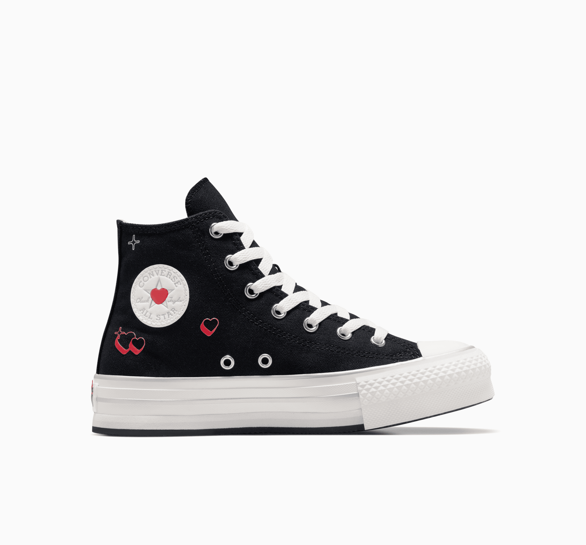 - Potlač srdiečok na nášivke Chuck Taylor a poznávacia značka All Star