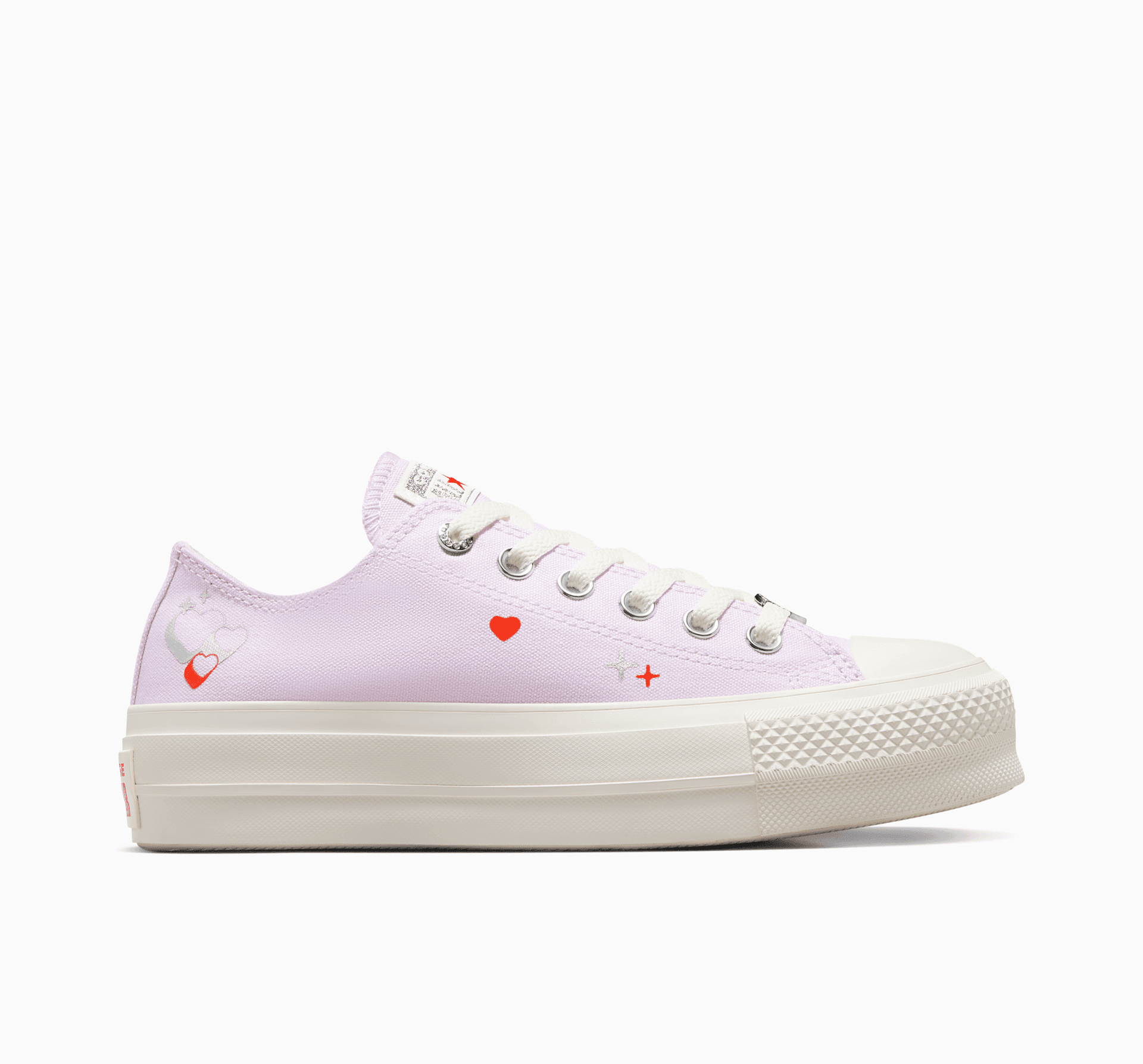 Tieto vyvýšené členkové tenisky zdobia srdiečka a metalické prvky, ktoré sú milostným listom časom Y2K. Srdiečko uprostred nášivky na členku je zárukou neobyčajného štýlu, ktorý by závidel aj samotný Amor.