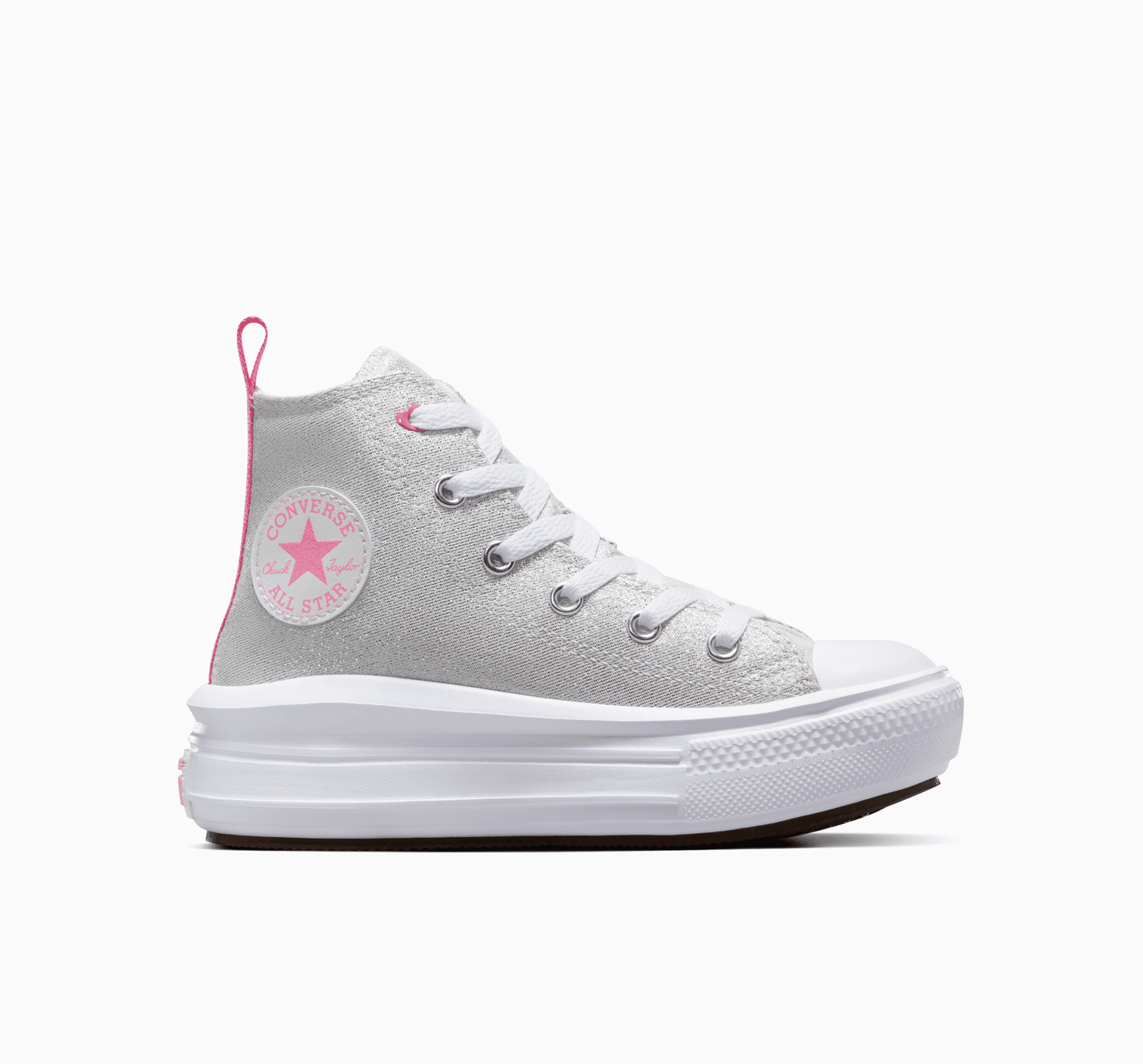 Rovnako ako vaše malé ja, tieto tenisky Chuck zažiaria. V týchto ľahkých platformách s hravými detailmi ružovej a trblietkami zapôsobíte. Kúzlo v nich prebudia očká v tvare srdca. Vďaka nasadzovaciemu popruhu na zadnom diely ich každé dieťa rado obuje a bude sa v nich ukazovať.
