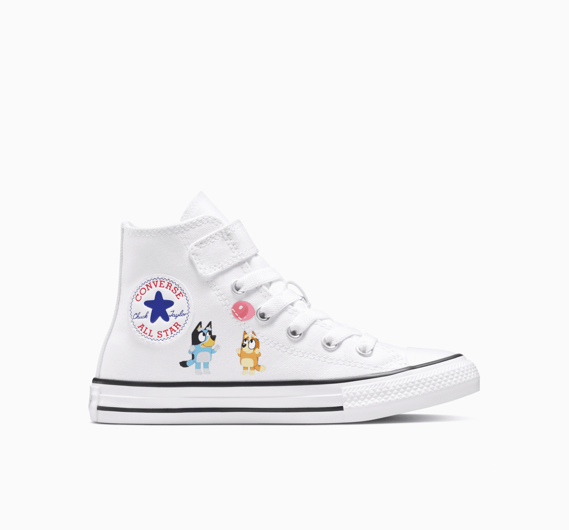 Wackadoo! Bluey sa objavuje v klasickom modeli Chuck Taylor All Star pre deti s farbami a grafikou inšpirovanou seriálom. Dizajn kombinuje grafiku z epizódy „Keepy Uppy“ s typickými detailmi Chucka, ako je vytlačená nášivka na členku, čierne pásiky a retro poznávacia značka. Osláv nadčasovú silu kreatívnej hry s klasickým štýlom Converse.