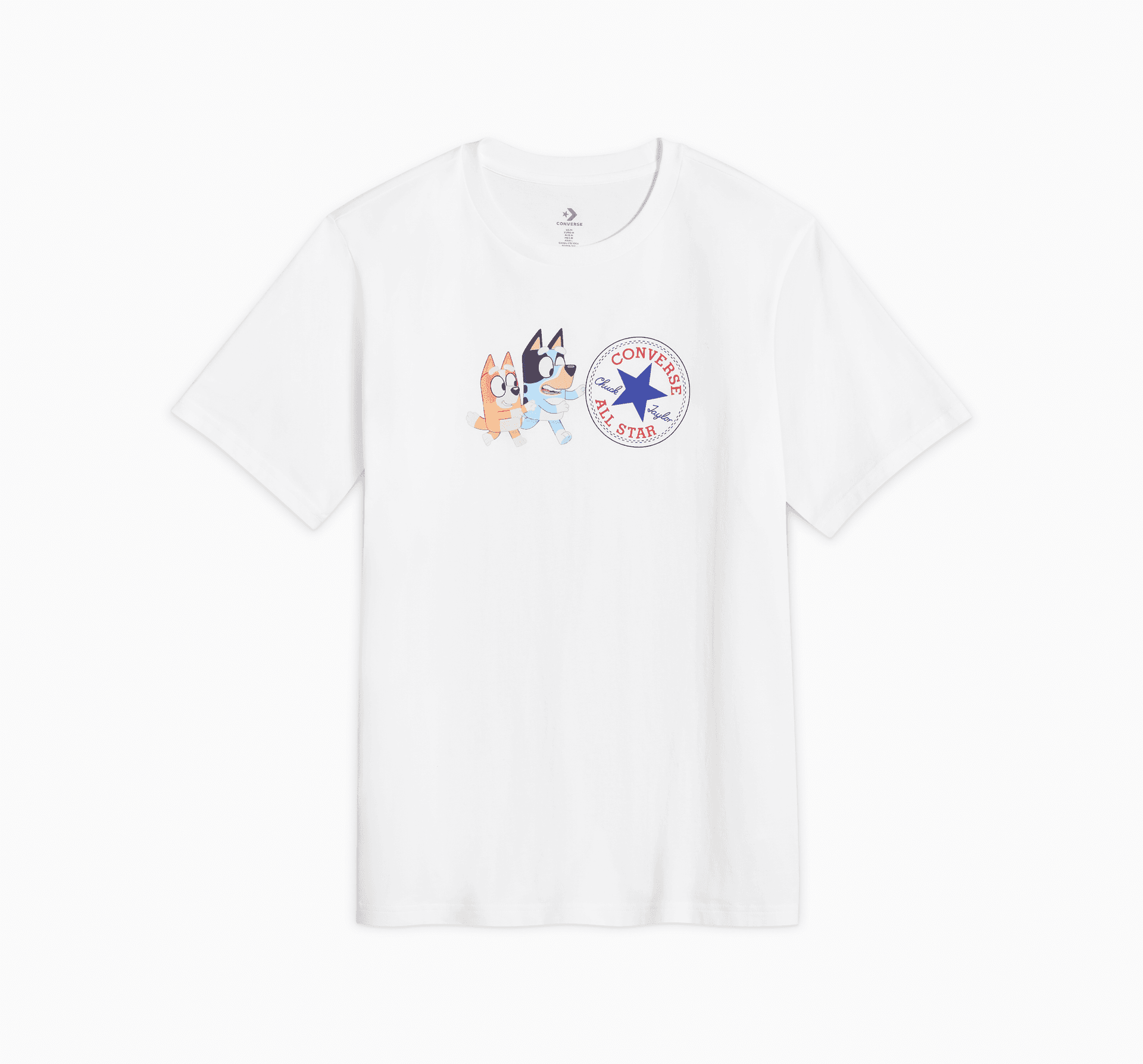 Osláv silu kreatívnej hry s limitovaným tričkom Bluey, s postavami Bluey a Bingo a nášivkou Chuck Taylor All Star.