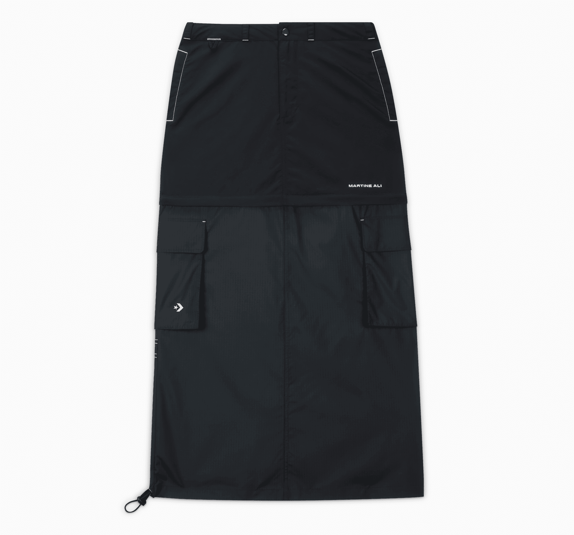 Martine Ali prináša do novej limitovanej edície sukne podvratný nádych a zdôrazňuje modulárny prístup s nylonovou a ripstopovou konštrukciou, ktorú možno nosiť dvoma spôsobmi. Dvojdielnu sukňu spája zapínanie na zips pre štýlovú všestrannosť a premyslené detaily vrátane cik-cak a riflového prešívania, jedinečných vreciek a vyšívaných log oboch značiek.