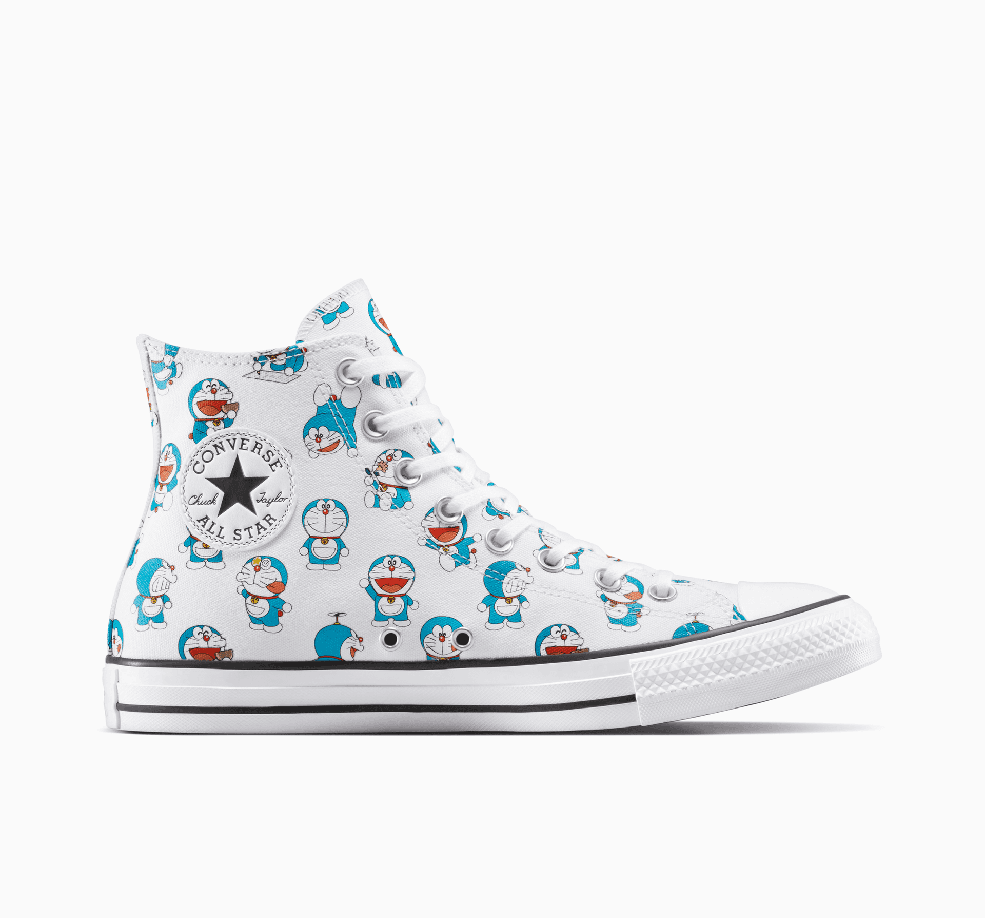 Doraemon Daze! Converse celebrates the beloved Japanese manga and anime series about a cat-type robot from the future with a pair of Chuck Taylor All Stars. The limited-edition design features an all-over print of Doraemon with an array of playful expressions and secret gadgets.