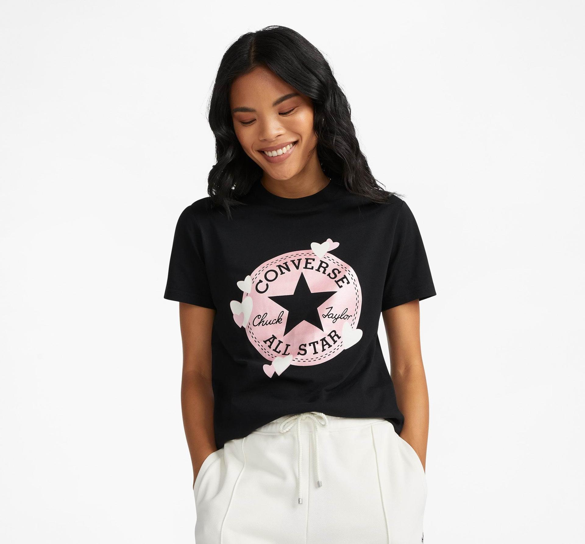 Мини на по-високо ниво, в нощта за свалки, с тази тениска пасваща идеално. Тя ви дава настроение за любов, с голямо Чък лого и покрита с дръзки сърца. Плюс това, класическото деколте може да се носи самостоятелно или в комплект с любимия ви пуловер.