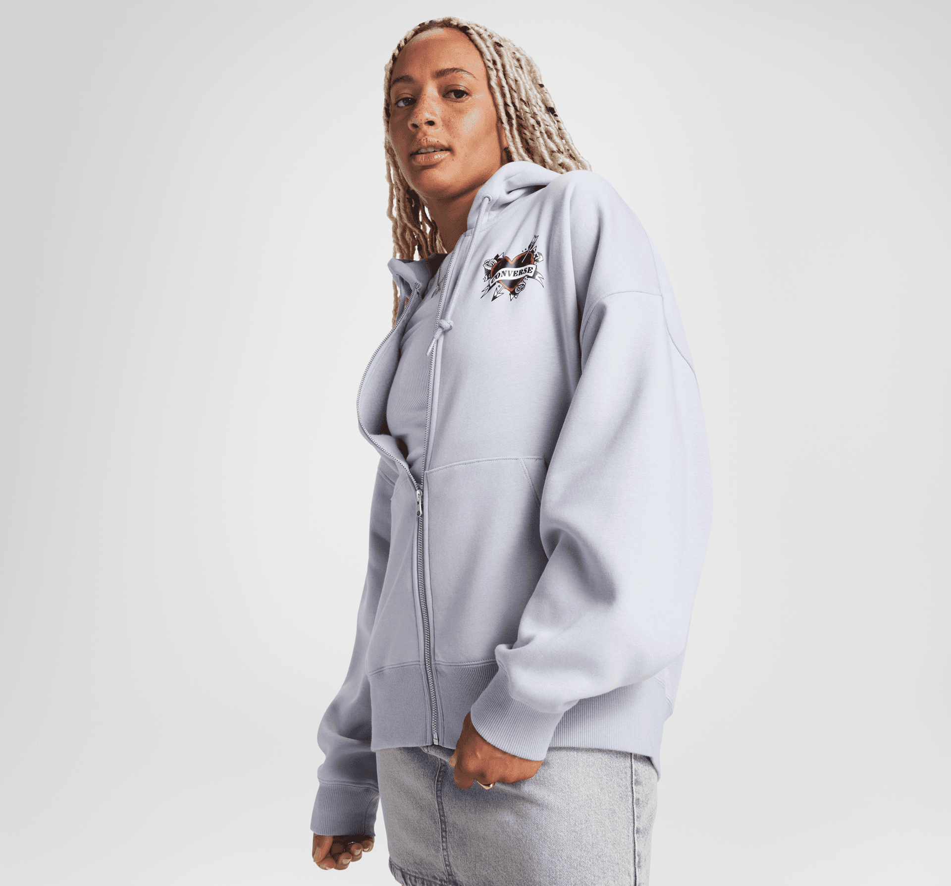 Mikina s kapucňou a potlačou, ktorému sa vzorom stalo umelecké tetovanie, ukazuje rebelskú stránku vášho života – samozrejme s láskou.